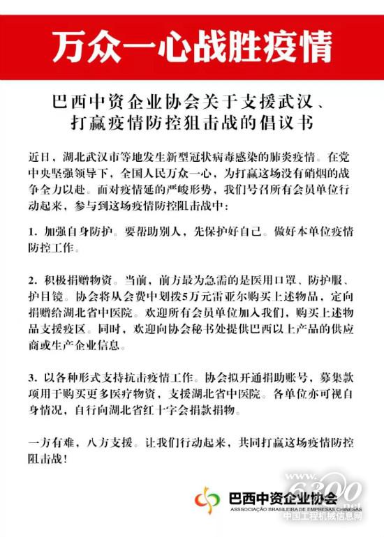 倡议发出后,作为巴西中企协会长单位的徐工巴西率先垂范,立刻在全体员工范围内发动捐款,支援武汉疫情阻击战。