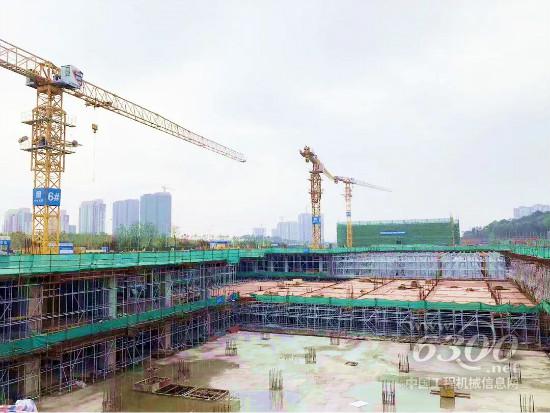 4月8日,在湖北广电传媒基地施工现场,中联重科5台T6515、T7020塔机正在紧锣密鼓施工,不久以后,中联重科的远程操控塔机和W系列新品塔机也将入场安装。