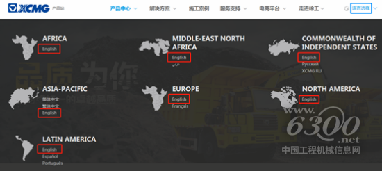 1.从徐工官网“语言选择”(下图标注蓝色区域)入口处进入七大区域英文版界面入口(下图标注红色区域)。