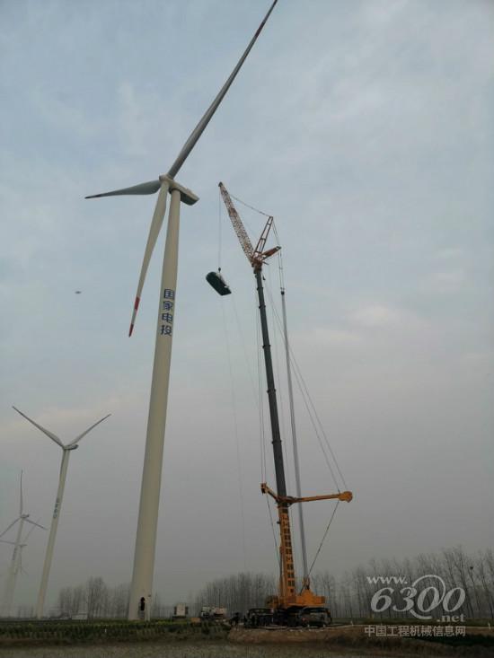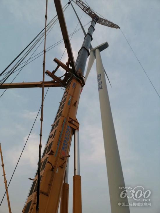 江苏省盐城市滨海港风电场,塔筒高度130米,枪舱3吨,电机轴承1吨,QAY650A采用主臂74.7米+变幅副臂56米,87吨配重的工况,将目标吊至134米高处。