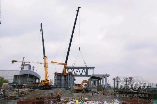 江苏盐城东台站天桥施工现场,天桥桁架横跨一、二、三站台,跨度44.6m,桁架重118.3t,QAY650A大气不喘分两段吊装完成。