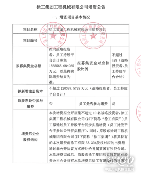 2020年6月24日,徐工机械的控股公司徐工集团工程机械有限公司(以下简称“徐工有限”)发布重磅消息:徐工混合所有制改革涉及的增资项目在江苏省产权交易所正式挂牌,拟向战略投资者、员工持股平台合计募集156.56亿元(对应持股比例为49%)。本次挂牌终止日期为2020年8月20日。
