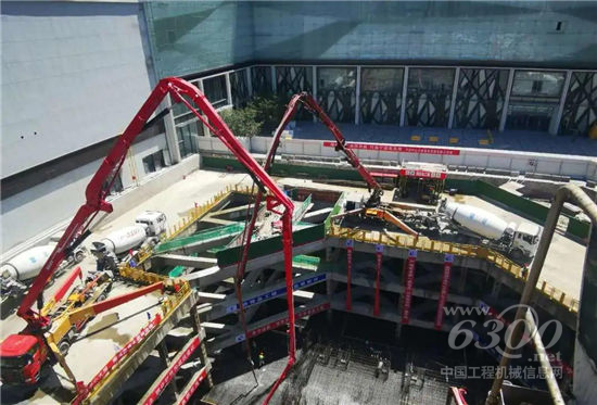由三一泵送设备参建的宁波“超级地标”——宁波中心大厦,历经55个小时高强度连续施工,于上月完成了2.2万方混凝土基础底板浇筑。创造了宁波地区民用建筑中临近地铁最深基坑、超厚基础底板的一次性连续浇筑纪录。为确保4.2米厚、钢筋含量达5200吨的2.2万立方米高性能混凝土一次性浇筑成型,项目部组织了200余名建设者投入大会战。三一重工5台56米泵车、2台49米泵车全程参与此次建设,为工程保驾护航。