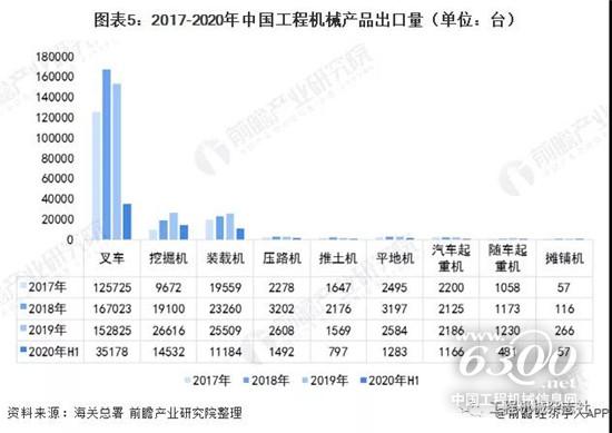 2017-2020年上半年,我国出口叉车数量最多,远远超过了其他品类的工程机械设备。在2020年上半年,我国累计出口整机59.93亿美元,同比下降20.5%,占出口总额的61%;零部件出口37.97亿美元,同比下降15.8%,占出口总额的39%。1-6月出口额减少的主要有:零部件、叉车、装载机、隧道掘进机和非公路用自卸车等。出口额增加的主要有:履带挖掘机、100吨以上全地面汽车起重机、摊铺机和沥青搅拌设备等。