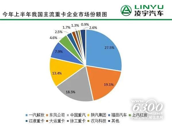 一汽解放继续保持领先地位,6月份销售重卡约3.25万辆,今年上半年解放重卡累计销售28.49万辆,同比增长24%,市场占有率为27.5%。