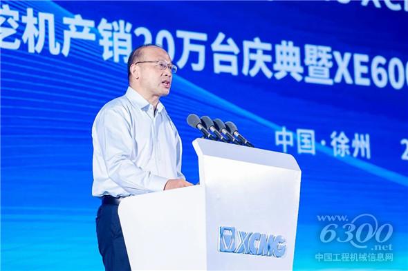 王民、吴培国、宋之克等领导嘉宾共同揭开了徐工挖机第20万台挖掘机的神秘面纱——XE380DK液压挖掘机