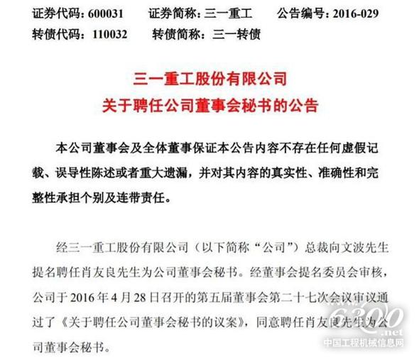 肖友良先生肖友良先生出生于1968年,1989年就加入了三一重工,是在公司工作了32年的老将。主要负责财务管理、审计等工作,历任公司财务本部部长、审计部主任、财务副总监、财务总监以及董事会秘书等职务。有意思的是,这不是肖友良先生第一次卸任董秘职务。在2010年7月出任公司董秘,并于2015年8月4日因工作变动,辞任董秘职务。在这段时间里肖友良先生荣获新财富“金牌董秘”、中国上市公司市值管理高峰论坛“中国上市公司最佳创富IR”,证券时报“最佳投资者管理董秘”、理财周报“中国上市公司最佳董事会秘书”等荣誉称号。在辞职后不到一年后的2016年4月,经过总裁提名,肖友良先生重新被董事会聘为董秘。