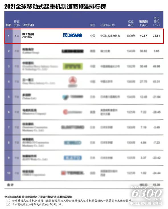 “2021全球移动式起重机制造商10强”