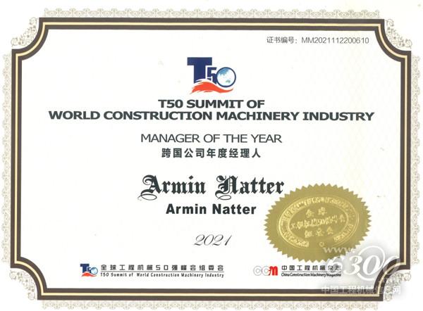 PR776能有幸获选于国家重点建设项目,这背后离不开利勃海尔在矿山领域深耕70年的成熟技术,更离不开利勃海尔全体中国同仁的共同努力。此次峰会上,组委会特地为利勃海尔董事总经理、土方机械与矿山设备事业部总经理Armin Natter那德明颁发“跨国公司年度经理人”荣誉称号。