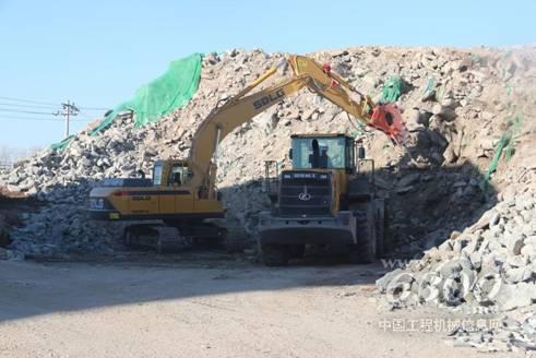 走进公司的厂区,一派热火朝天的工作场景:多台临工L955F装载机来回穿梭,有的在卸料,有的在过筛;不远处,一台临工E6210FHD挖掘机正在破碎建筑垃圾。