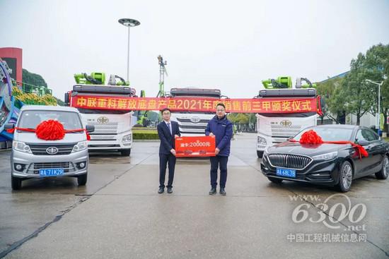 在一片热烈喜庆的氛围中,中联重科混凝土机械营销公司副总经理张良、 一汽解放青岛汽车有限公司专用车部销售经理韩明浩为冠亚季军,颁发红旗H5轿车、解放皮卡、2万元加油充值卡等大奖,以表彰先进树立典型,激励一线将士虎年再创辉煌。