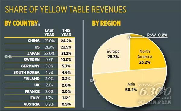 Yellow Table 2022榜单中,中国工程机械企业销售额占总销售额24.2%,是占比最高的国家;美国工程机械企业占总销售额22.9%;日本工程机械市场占总销售额21.2%。(Yellow Table表中的数据显示的是所列公司的营业收入,不代表一个地区自身的或一个国家整体的营收表现。另外该榜单数据范围基于2021自然年,但在日本、印度以及其它的一些国家,数据范围为2021财年,即2021年4月1日至2022年3月31日。)