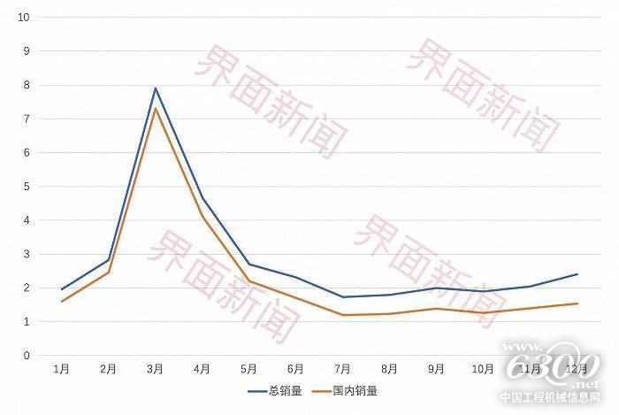 挖掘机去年销量走势 单位:万台 数据来源:中国工程机械工业协会 制图:马悦然