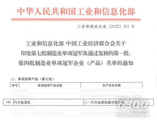 三一汽车起重机荣获国家级“单项制造冠军”!