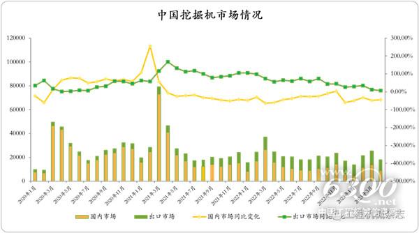 经草根调查和市场研究,CME预估2023年4月挖掘机(含出口)销量18000台左右,同比下降26%左右,降幅环比小幅收窄。分市场来看:国内市场预估销量9000台,同比下降44%左右。出口市场预估销量9000台,同比增长6%左右,涨幅继续收窄。
