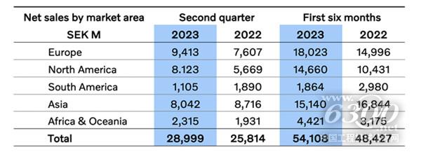沃尔沃建筑设备2023年第二季度及上半年净销售额数据(按区域划分)