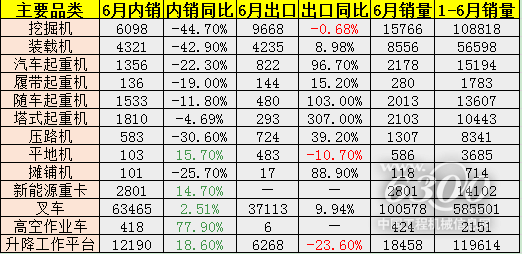 6月销售各类汽车起重机2178台,同比增长0.65%,其中国内市场销量1356台,同比下降22.3%;出口市场销量822台,同比增长96.7%。