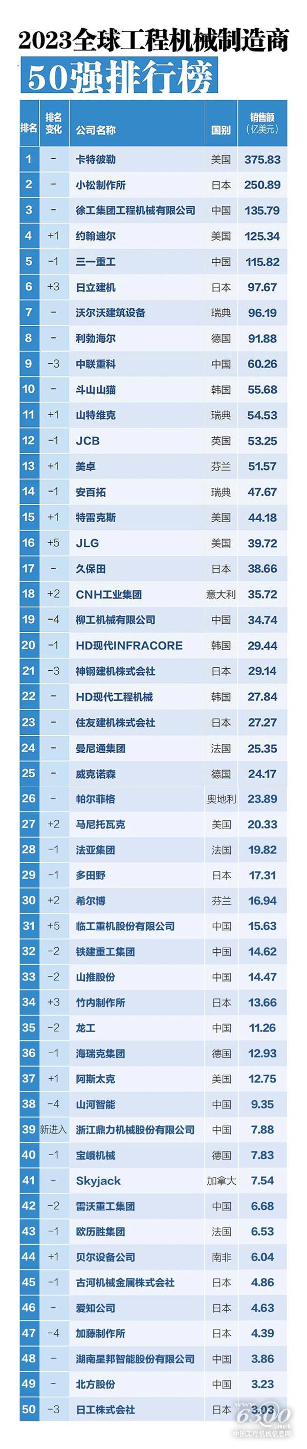 2023年全球工程机械制造商50强,销售额2238.06亿美元,增幅1.10%;营业利润245.52亿美元,增幅6.17%;营业利润率10.97%。