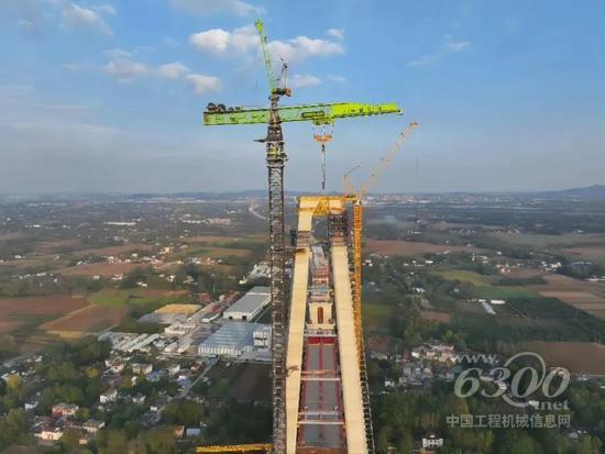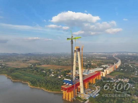 ▲全球最大塔机中联重科R20000-720助力巢马铁路马鞍山长江公铁大桥南主塔双塔肢合龙