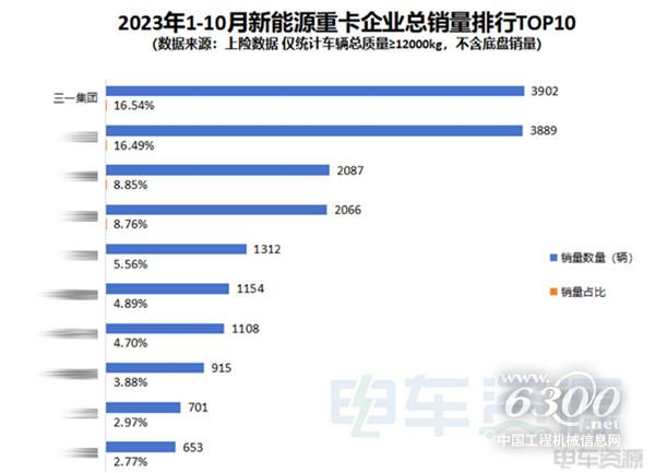 4.全国前10月新能源重卡市场,三一市占率16.5%再夺冠;