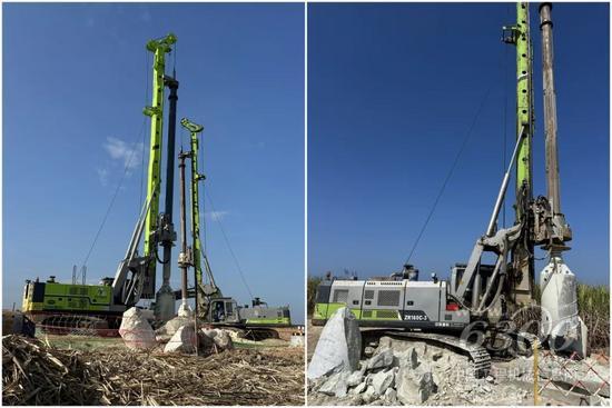 据项目负责人介绍,海南当地地层复杂多变,岩层高低不等,普通旋挖钻机设备施工困难重重,遇到砂土层极易出现塌孔,遇到中风化花岗岩层,截齿消耗较大,还容易出现取岩芯困难的问题。ZR180G旋挖钻机具备高稳定、高效率、高精准的施工特点,可实现一次性成孔,高度契合该项目需求,对比同类产品施工表现更出色。
