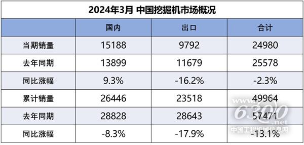 据中国工程机械工业协会对挖掘机主要制造企业统计,2024年3月销售各类挖掘机24980台,同比下降2.34%,其中国内15188台,同比增长9.27%;出口9792台,同比下降16.2%。