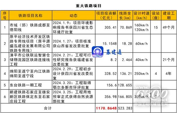 据隧唐科技·基建通大数据(cnsuido01)统计,2024 年一季度(1-3 月份),累计约有 40 项投资额在 5 亿元以上的重大铁路、公路、城轨交通和机场项目获自然资源部、生态环境厅、省级发改委/交通厅、市级发改局/交通局等批复,批复内容包括工程可行性研究报告、初步设计、施工图设计、项目建设用地、项目核准、环评报告等,项目总投资额近 4500 亿元。其中,铁路项目约 1170 亿元,公路项目约 2522 亿元,城轨交通项目 374 亿元,机场项目 426 亿元。