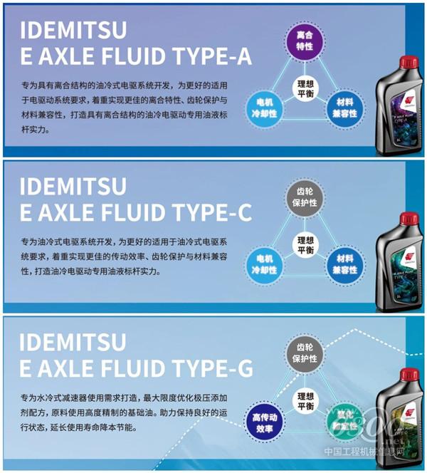 目前,不少润滑油头部企业均已争相入局新能源汽车润滑油液领域。以出光润滑油为例,便针对新能源汽车特有的工作环境和性能要求,推出了专门设计的E-Axle润滑油系列:包括专为具有离合结构的油冷式电驱系统开发的TYPE-A、专为油冷式电驱系统开发的的TYPE-C和专为水冷式减速器打造的TYPE-G。