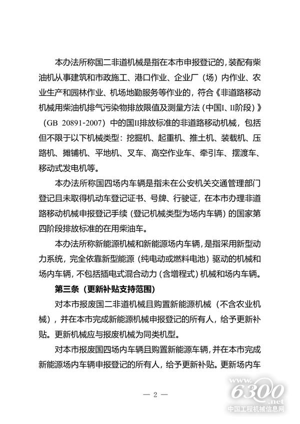 办法所称国二非道机械是指在本市申报登记的,装配有柴油机从事建筑和市政施工、港口作业、企业厂(场)内作业、农业生产和园林作业、机场地勤服务等作业的,符合《非道路移动机械用柴油机排气污染物排放限值及测量方法(中国Ⅰ、Ⅱ阶段)》(GB 20891-2007)中的国Ⅱ排放标准的非道路移动机械,包括但不限于以下机械类型:挖掘机、起重机、推土机、装载机、压路机、摊铺机、平地机、叉车、高空作业车、牵引车、摆渡车、移动式发电机等。