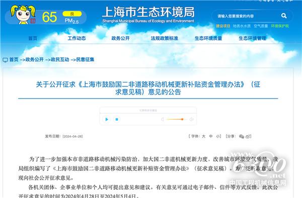 为持续改善环境空气质量,进一步减少移动源污染物排放,加快国二排放标准非道路柴油移动机械(以下简称“国二非道机械”)更新,提升移动源清洁化水平,4月28日,上海市率先发布了关于公开征求《上海市鼓励国二非道路移动机械更新补贴资金管理办法》(征求意见稿)意见的公告,明确了上海地区国二非道路移动机械更新补贴的具体管理办法,同时提到了国四场内车辆更新补贴的相关条款。