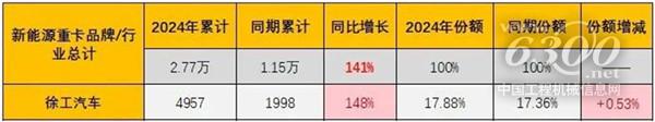 据第一商用车网发布的榜单显示,2024年1-6月,徐工新能源重卡累计销量4957辆,继2023年度累销冠军、2024一季度累销冠军的良好势头,再次荣登2024年半年度新能源重卡销量榜首。