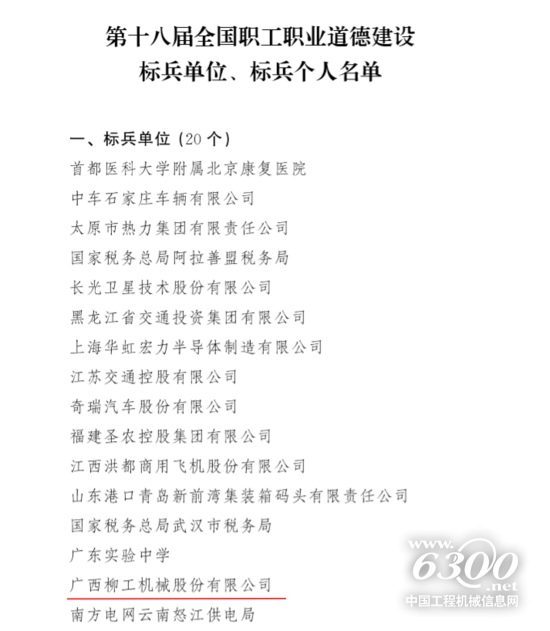 近日,全国总工会、中央宣传部、工业和信息化部、商务部、国务院国资委五部门联合发文,表彰第十八届全国职工职业道德建设标兵单位和个人,广西柳工机械股份有限公司(以下简称:柳工)入选第十八届全国职工职业道德建设标兵单位,为广西此次唯一入选单位,这也是柳工首次获此殊荣