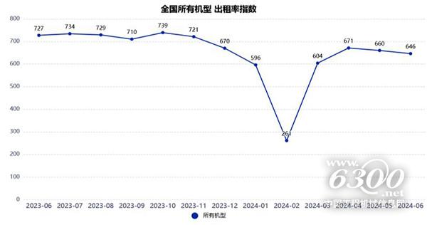 2024年6月升降工作平台出租率指数为646点,环比下降2.1%,同比下降11.1%。所有剪叉机型环比出租率指数均略有上升,所有臂车机型出租率指数环比均呈下降状态,环比上升幅度最大的是8~12m机型,涨幅为5.6%,环比降幅最大的机型是36~39m,达到9.5%。2024年6月出租率指数同比出现普遍下滑态势,8~12m、20~24m、30~35m和40m以上等机型同比出租率指数降幅超过10%,其他机型略有下降。其中8~12m机型降幅最大,达到17.7%。(出租率是以台天数为基准进行计算,100%出租率对应1000点。)