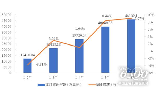 根据中国重型机械工业协会数据,矿山机械行业1-6月实现进出口总额27.06亿美元,同比增长24.38%。其中,出口额25.39亿美元,同比增长24.01%;进口额1.67亿美元,同比增长30.40%;进出口顺差23.72亿美元,同比增长23.58%。