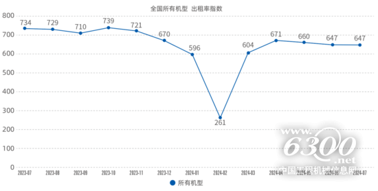 2024年7月升降工作平台出租率指数为647点,环比处于持平状态、同比下降11.85%。总体看7月份升降工作平台出租率喜忧参半,4类机型略有增长,另外4类略有下降,其中环比出租率下降幅度最大的机型为40m以上(含40m),降幅达8.99%,环比出租率增长最大的机型为20~24m(含20m、24m),涨幅为4.64%。2024年7月出租率同比下降幅度较大,除36~39m(含36m、39m)有小幅上涨外,其他所有机型出租率指数同比均处于下滑态势,其中26~28m机型降幅最大,达到18.23%。(出租率是以台天数为基准进行计算,100%出租率对应1000点。)