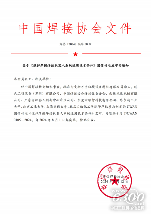 《搅拌摩擦焊接机器人系统通用技术条件》(T/CWAN 0105-2024)团体标准,由中国焊接协会焊接设备分会专家委员会提出并组织编制,安徽万宇机械设备科技有限公司牵头起草,于2024年7月12日正式对外发布,2024年8月1日起实施。