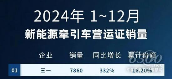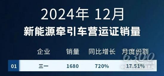 此外,2024年12月,三一获得新能源牵引车达到销量1680台,占据月度销量榜首,同比增长720%,增幅达到暴涨级别。