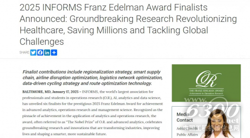 北京时间1月18日,国际运筹学与管理科学学会(INFORMS)正式公布2025年弗兰兹·厄德曼奖(Franz Edelman Award)最终入围名单,全球仅有六家企业获得提名。其中,顺丰凭借“顺丰物流网络规划智能解决方案”项目入围,成为本年度入围决赛的唯一中国代表。