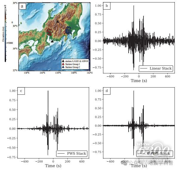 不同叠加方法的互相关函数结果,测试数据为日本Hi-net,(a)中黑色三角形为测试台站。