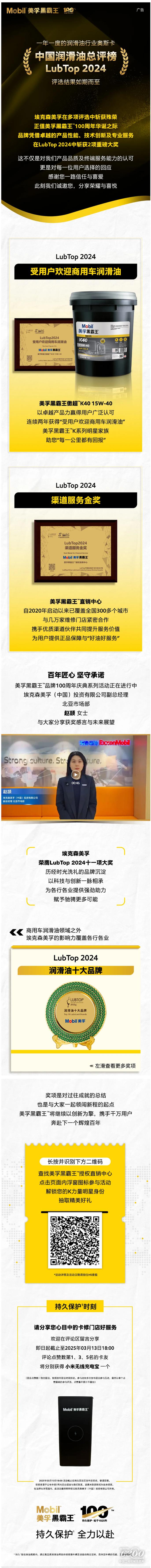 献礼品牌百年华诞|美孚黑霸王™荣膺LubTop 2024产品及服务大奖