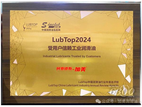 加美润滑油再次荣获LubTop2024受用户信赖工业润滑油称号