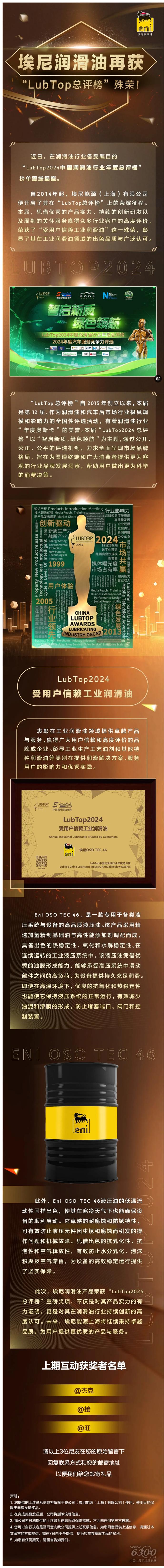 埃尼润滑油再获 “LubTop总评榜”殊荣!