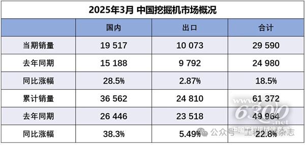 据中国工程机械工业协会对挖掘机主要制造企业统计,2025年3月销售各类挖掘机29590台,同比增长18.5%。其中国内销量19517台,同比增长28.5%;出口量10073台,同比增长2.87%。