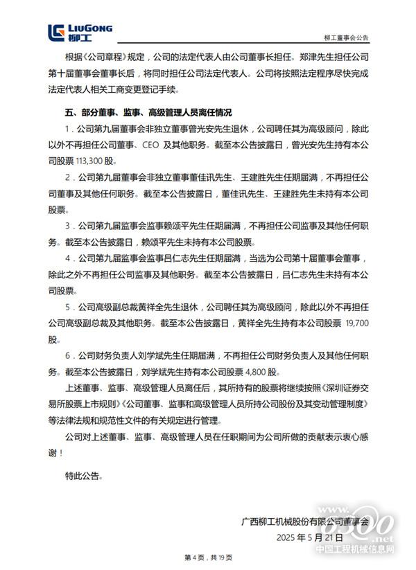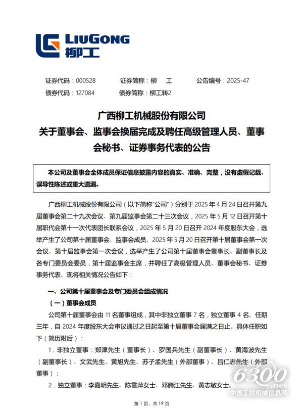 柳工公告丨郑津先生任董事长, 罗国兵先生任总裁