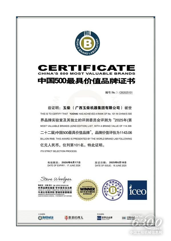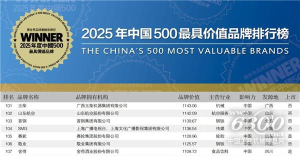 6月18日,2025年(第二十二届)世界品牌大会暨中国500最具价值品牌发布会在北京举行。玉柴凭借卓越的品牌影响力和持续创新的企业实力,以1143.06亿元的品牌价值,位列“中国500最具价值品牌”榜单第101名、内燃机行业首位。