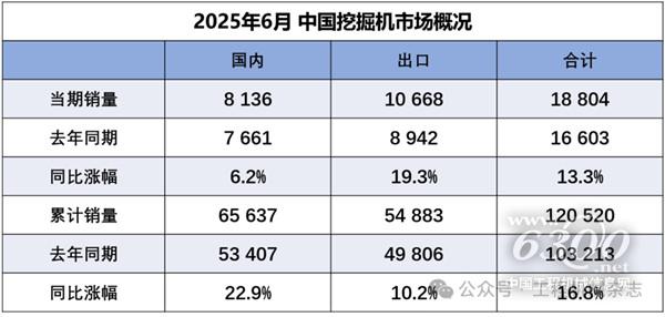 据中国工程机械工业协会统计,2025年6月销售各类挖掘机18804台,同比增长13.3%。其中国内销量8136台,同比增长6.2%;出口量10668台,同比增长19.3%。