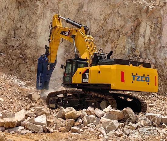 该矿区资源储量丰富,但岩石硬度较高,配备破碎锤的太重超大型液压挖掘机TZ1000,以高效率和高稳定性被用户坚定地选择,在矿区施工作业中冲锋陷阵: