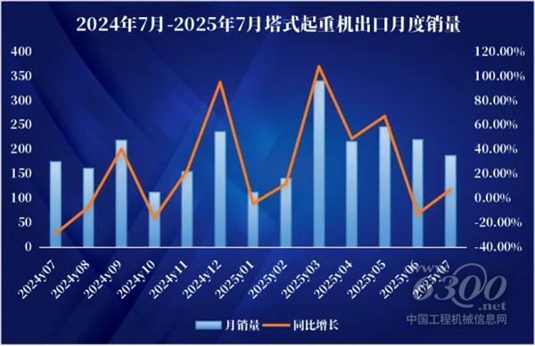 而海关总署最新数据显示,7月我国共出口塔式起重机612台,总金额为0.64亿美元,同比增幅达86.59%和68.34%;1-7月累计出口3906台,总金额4.19亿美元,同比分别增长50.93%和41.34%。协会与海关数据存在统计口径差异,协会统计主要反映大型制造企业的销售情况,而海关数据则涵盖了所有的出口产品,两者共同印证了出口市场的繁荣态势。