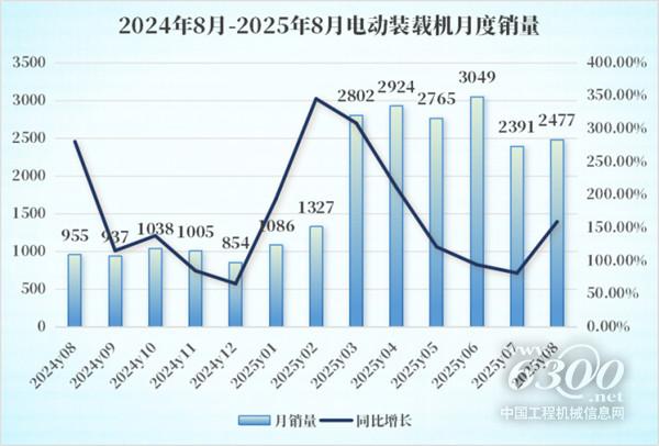 电动装载机保持高增长态势,8月共销售2477台,环比微升,同比激增159%。