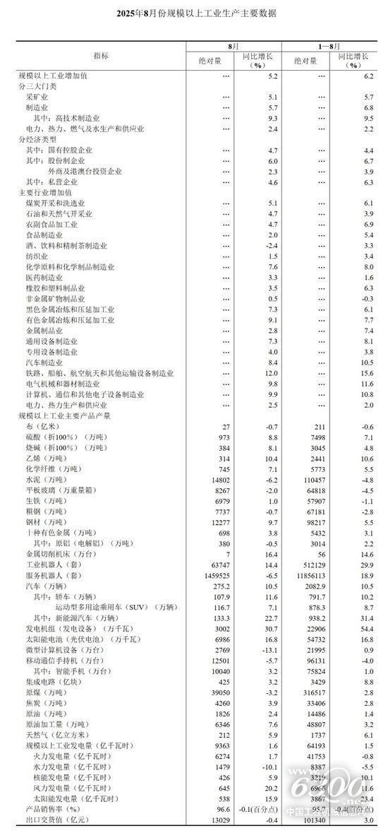 分三大门类看,8月份,采矿业增加值同比增长5.1%,制造业增长5.7%,电力、热力、燃气及水生产和供应业增长2.4%。